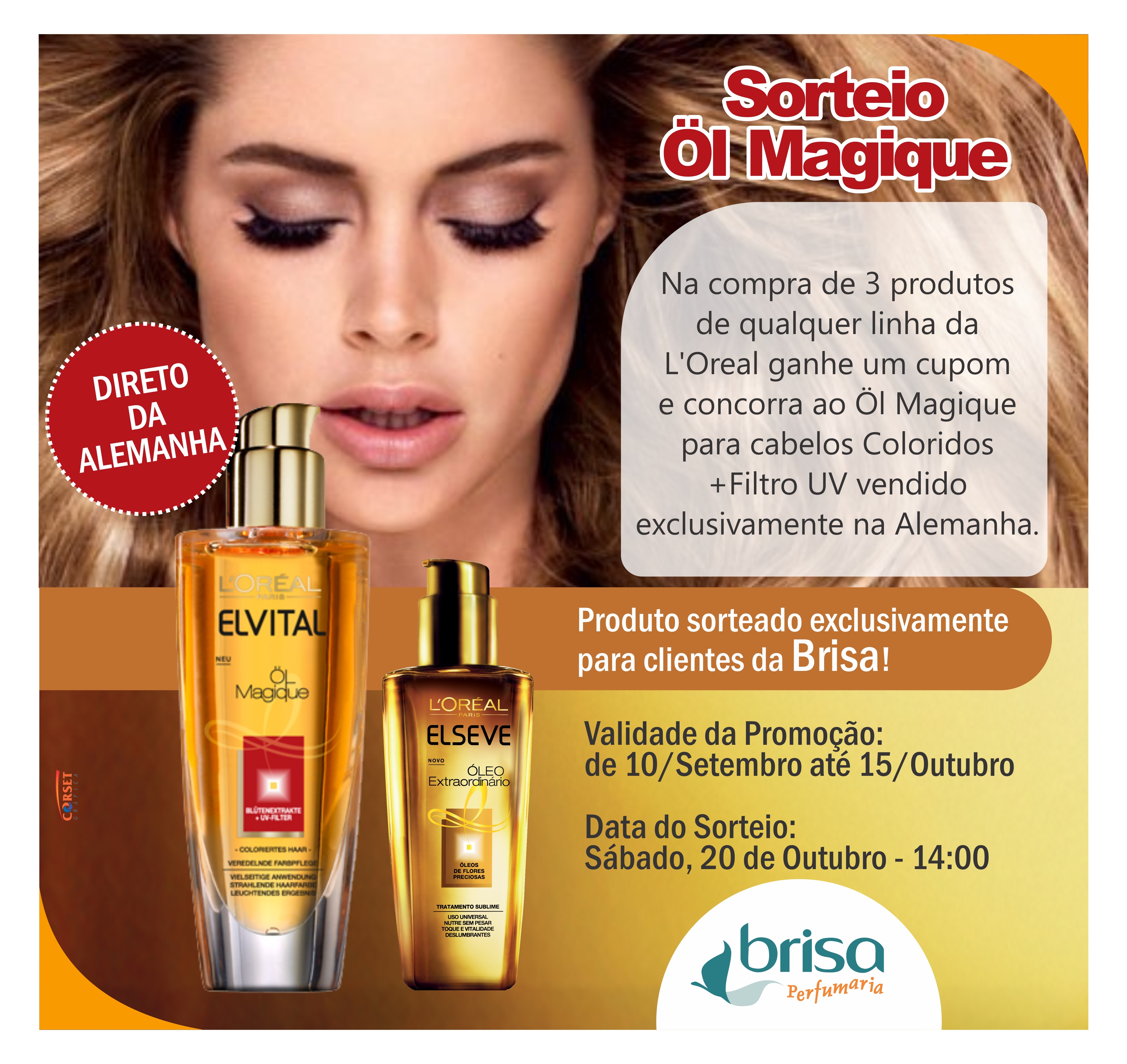 Na compra de 3 produtos de qualquer linha da L’Oreal, o cliente ganha um cupom e concorra ao Öl Magique para cabelos Coloridos, vendido exclusivamente na Alemanha.