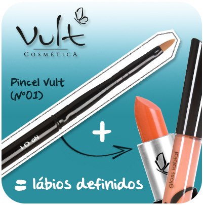 Pincel 01 da Vult – usado para maquiar os lábios, ele tem formato mais fino na ponta, o que, aliado às cerdas firmes, dá precisão na aplicação do produto. Isso faz com que a cobertura fique mais uniforme e que o desenho, perfeito! Vale lembrar que as cerdas são sintéticas.
