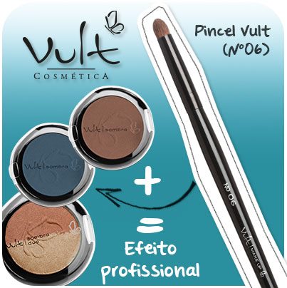 Pincel 06 da Vult – ele é um curinga para uso com sombras, pois permite a marcação do côncavo e também o efeito esfumado que todo mundo gosta. As suas cerdas são naturais (pelos de pônei) e bem macias. O processo de extração do pelo se dá por tosa, já que a Vult é uma empresa amiga dos animais!
