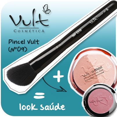 Pincel 09 da Vult – pincel feito para dar aquele ar de saúde. Ótimo para aplicação de blush e para os efeitos de contorno do rosto. O corte chanfrado facilita a aplicação precisa do produto e as cerdas são tão macias e volumosas que viram um verdadeiro carinho na pele.